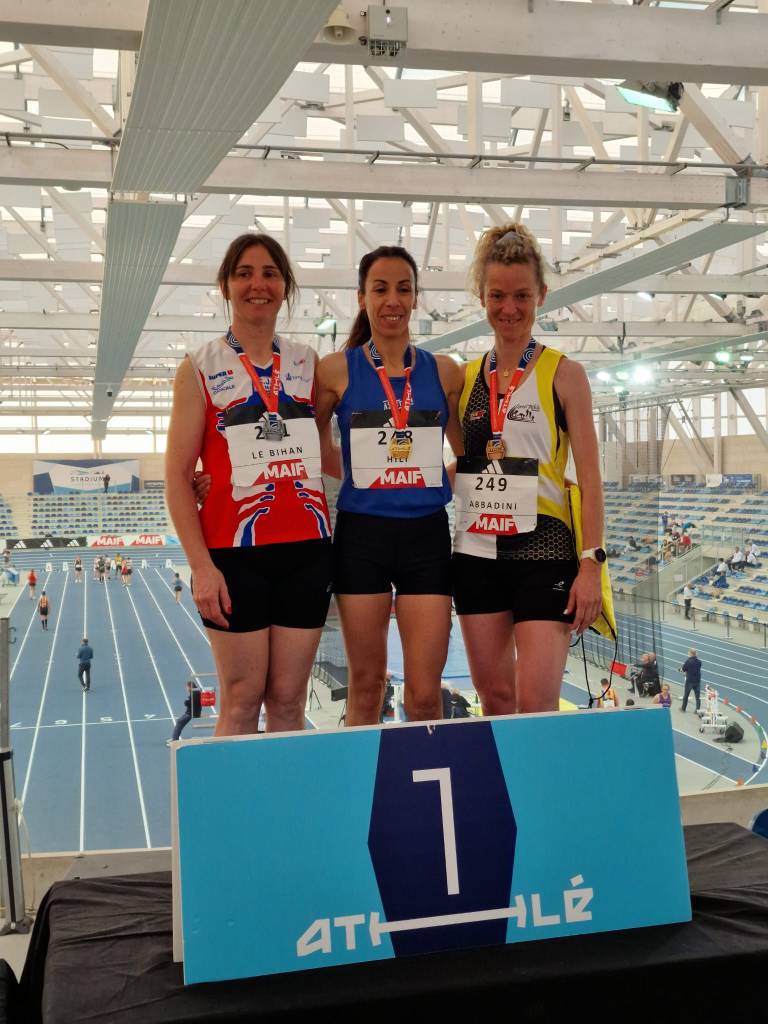 Nathalie ABBADINI réalise 5’26 au 1500m et 11’39 au 3000m et décroche une 3ème place sur ces 2 épreuves en F45.