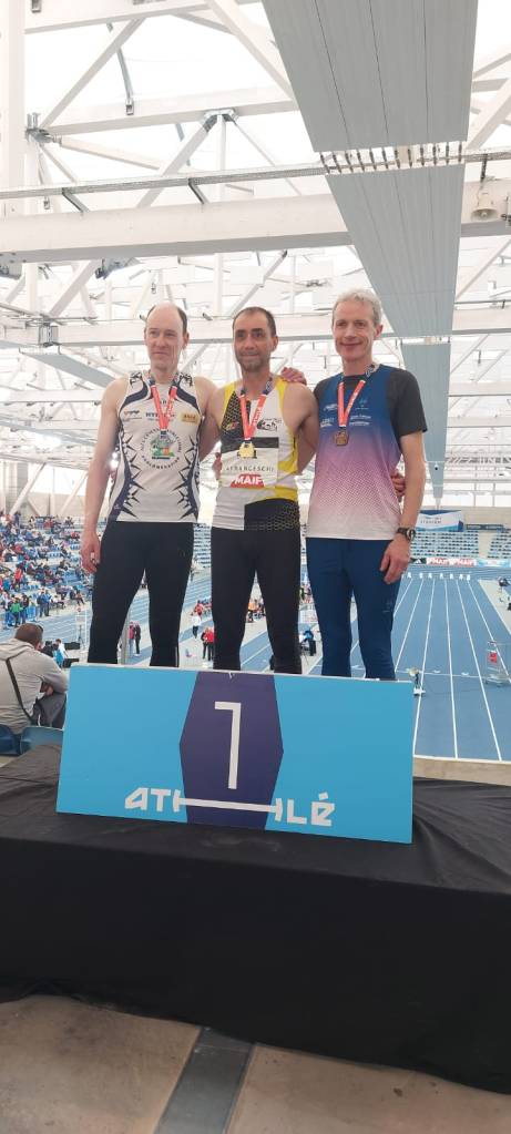Julien RIAUD en M40 décroche une belle 2ème place au 60mhaies le samedi avec 9 »77 et le lendemain, même place sur le pentathlon, malgré une douleur à la cuisse, avec 9 »97 sur 60mhaies, 5,54 en longueur, 8,97 au poids, 1,51 en hauteur et 3’47 au 1000m.